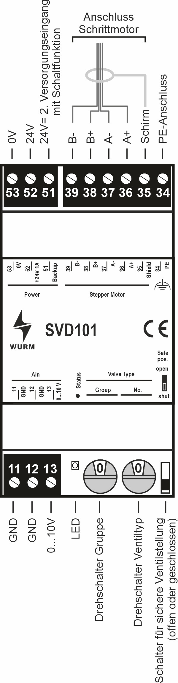 • Zweiter 24V= Versorgungseingang („Backup“ Klemme 51) mit Schaltfunktion: Ventil wird unabhängig von Stellgröße in sichere Ventilstellung gefahren (SVD001 und SVD101)